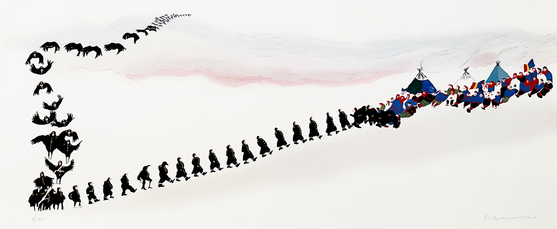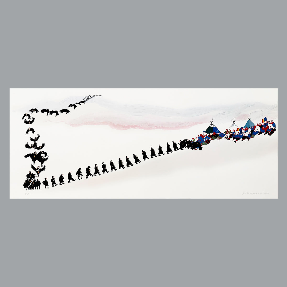 The silkscreen is inspired by the embroidery The Crows (1981). The work depicts the dramatic events of the Alta protests in the 1980s. In Sámi mythology, there is a belief in the significance of different animals and what they symbolize. Crows symbolize authority. They rule over others, spare no means and seize everything that comes their way.