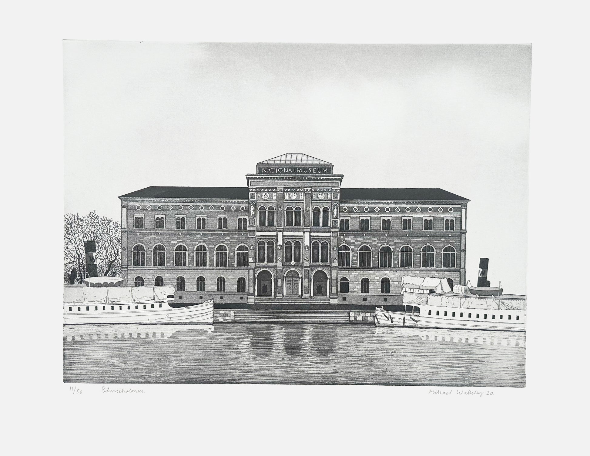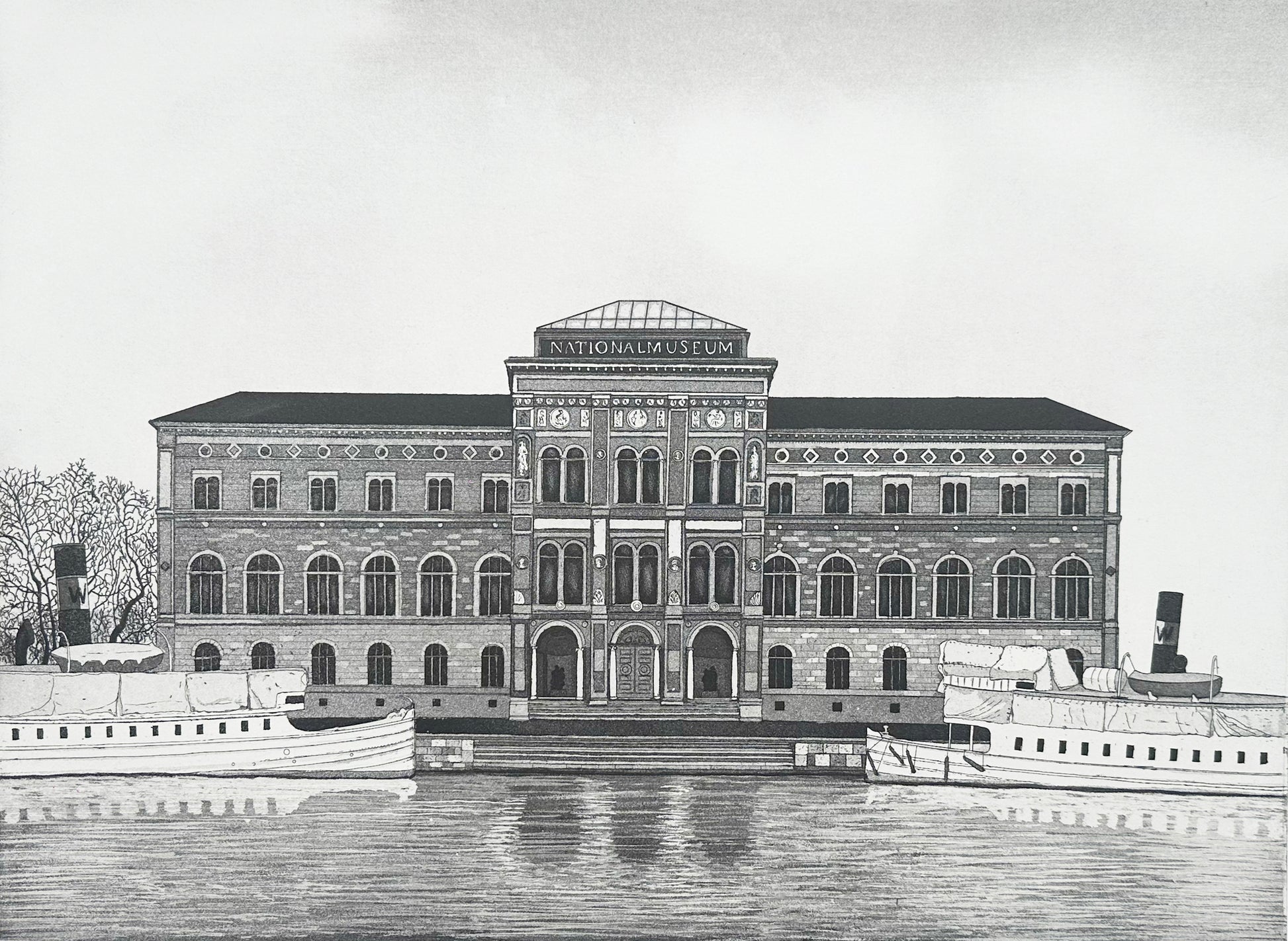 Med sitt centrala läge har Blasieholmen blivit platsen för en ståtlig bebyggelse som exempelvis Nationalmuseum. Delvis täckta av presenningar ligger skärgårdsbåtarna och väntar på sommarens turer.
