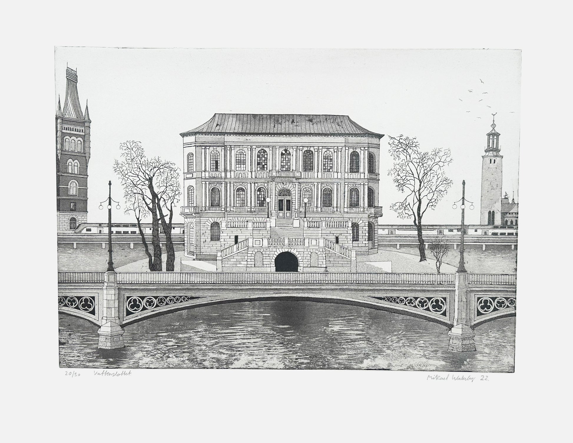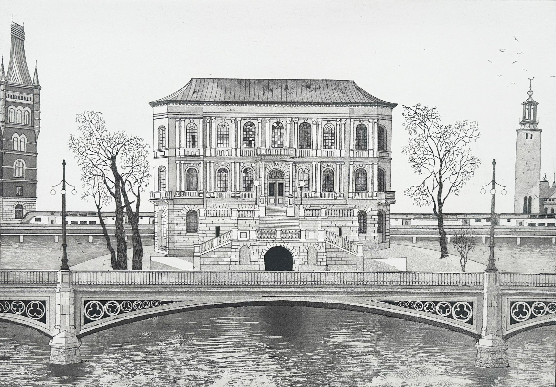 Ett utsvängt tak och en enhetlig färg förhöjer lättheten i det eleganta "Vattenslottet". Till vänster i bilden ligger Norstedt & Söners boktryckeri, som ett slott reser sig även denna byggnad ur vattnet, med ett torn som kallats för abborstjärten.